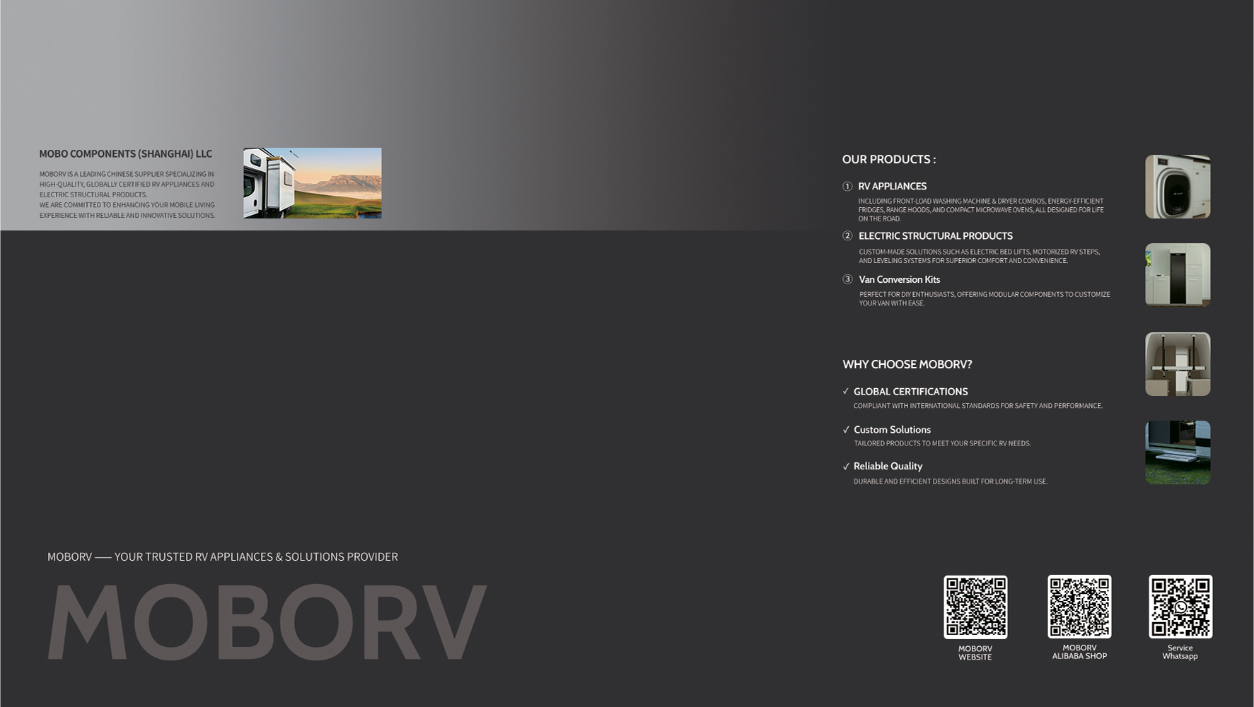 MOBORV is a leading Chinese supplier specializing in high-quality, globally certified RV appliances and electric structural products. We are committed to enhancing your mobile living experience with reliable and innovative solutions